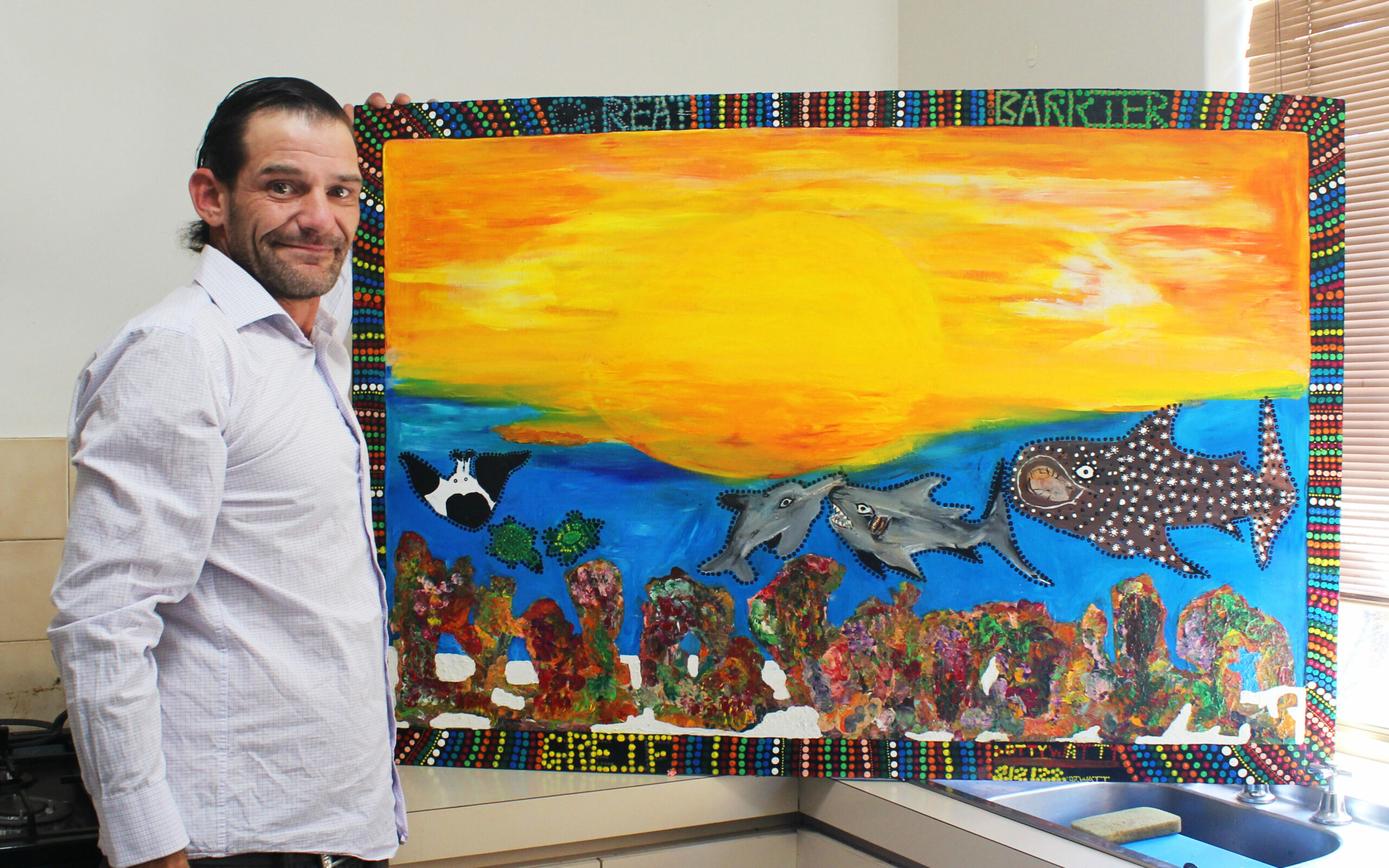 Damien’s artwork will also be featured in a 100 Families art exhibition in early June that will feature works from a range of artists with lived experience. Damien has also been spending lots of time with his grandkids. He takes them to school, and they paint together and sing songs that Damien has written.