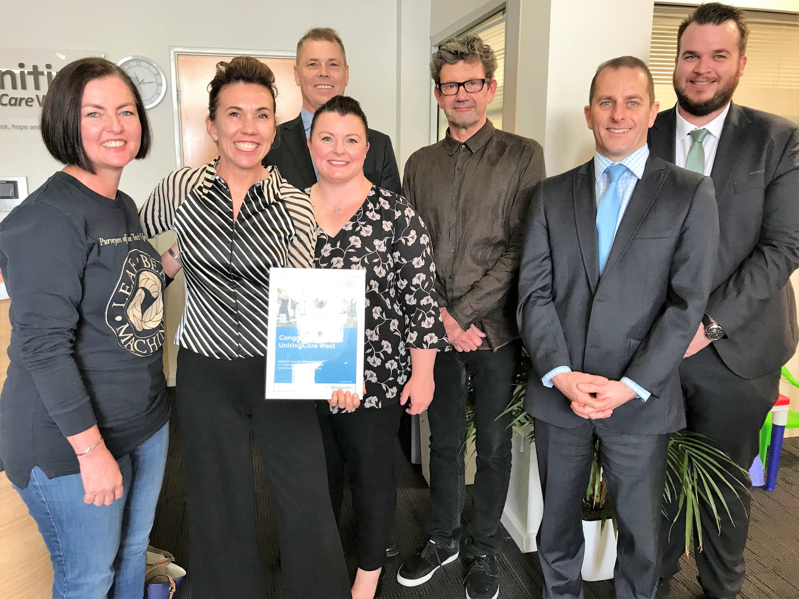 (L-R): Fleur Cassidy, Director Leaf Bean; Amanda Hunt, CEO UnitingCare West; Dennis Teale, State Manager Bendigo Bank; Rebecca Lucas, State Business Manager Community Sector Banking; Adam Barker, Creative Partner Gatecrasher Advertising; Mark Edwards, Regional Manager Bendigo Bank; and Reece Robinson, Perth Branch Manager Bendigo Bank.